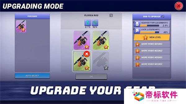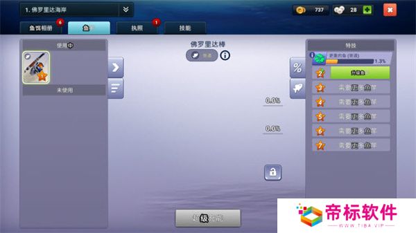 点击左侧的“装备”按钮,你可以查看并升级你当前的钓竿,提升其性能,帮助你捕获更多珍稀鱼类。