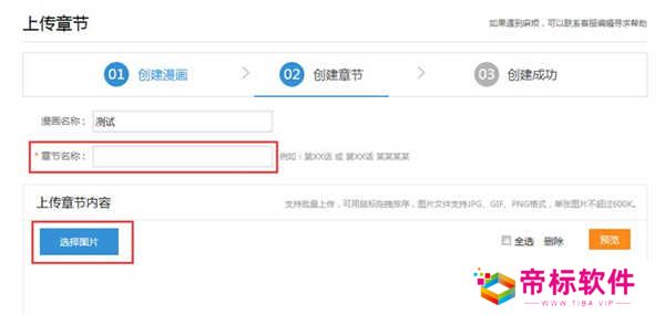 (1)、在创建章节页面,填写章节标题,并点击选择图片按钮上传图片,最后点击确定按钮即发布成功。