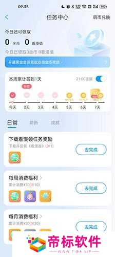 4、之后会来到任务中心页面,完成下列相应的任务可以获得萌币奖励。