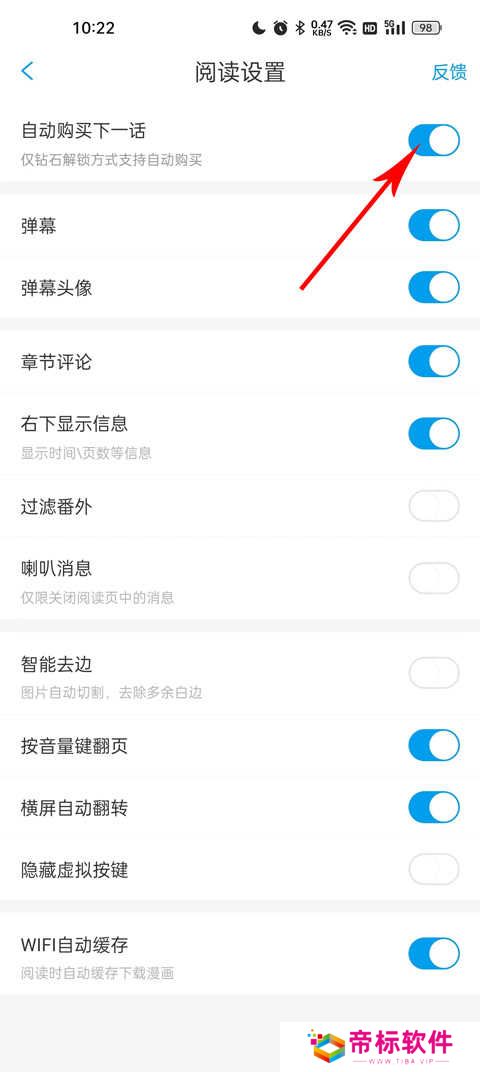 4、在阅读设置中,将自动购买下一话进行关闭,就可以取消自动续费功能了。
