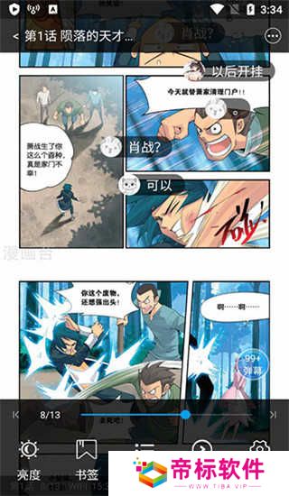3、进入动漫之后,点击屏幕的正中间会出现亮度、书签、目录、自动、设置等功能;