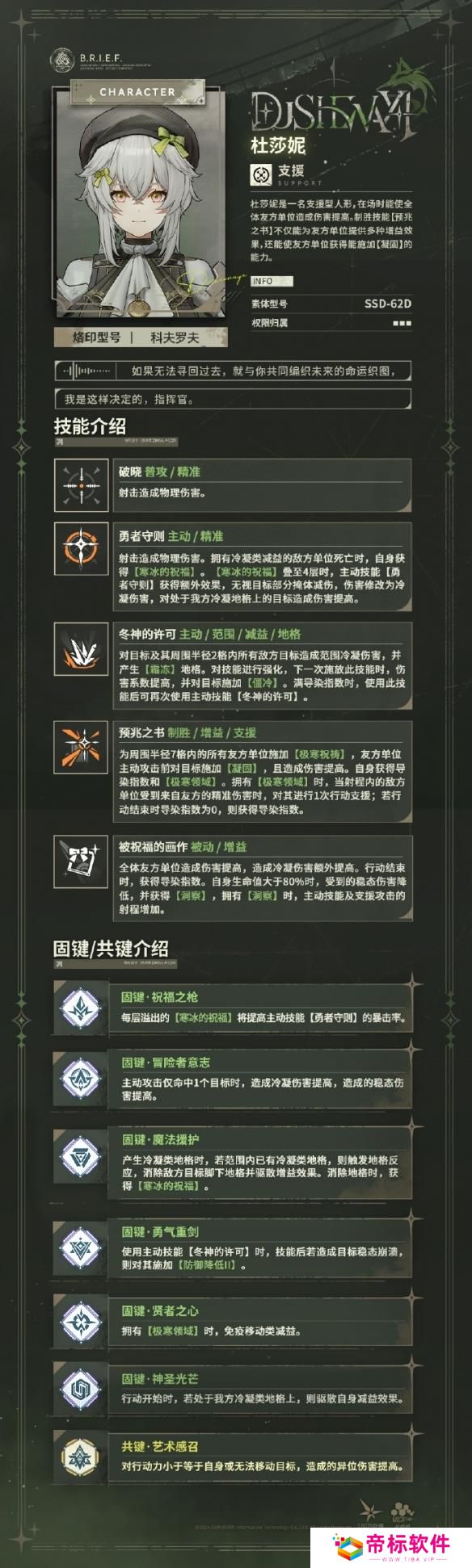 杜莎妮是一名支援型人形,在场时能使全体友方单位造成伤害提高。制胜技能【预兆之书】不仅能为友方单位提供多种增益效果,还能使友方单位获得能施加【凝固】的能力。