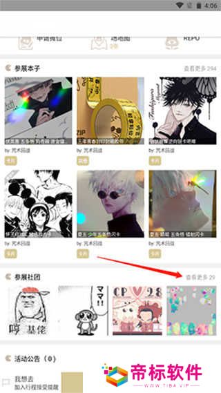 1、在买票界面下方的参展社团栏目点击查看更多按钮;