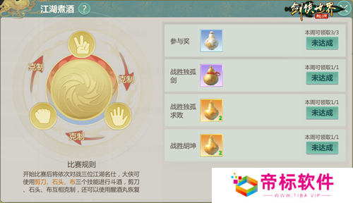 江湖煮酒不仅是对大侠们酒量和猜拳技巧的考验,更有丰厚的奖励等待着胜利者。每场游戏结束,无论输赢,参与的大侠均可获得一份参与奖励(每周最多领取三次)。而战胜其他江湖名仕,还可获得该名仕赠酒,使用后有机会获得银两、五行魂石、精铸石、玄晶等奖励。这些奖励均可在活动界面领取,让大侠们在斗酒中不仅享受豪情,更能收获实实在在的福利。