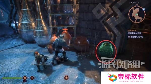 跟随瓦瑞克走过街道,遇到哈丁后注意探索地图,在每张地图的各种角落里都可以捡到黄金(货币)、材料、有价之物(用于卖钱)等。