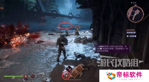 穿过传送门来到森林,使用重攻击(战士是挥盾)可以打破敌人的护甲(黄色)。