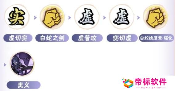 先用虚切实配合实技能白蛇之剑进行长距离起手,随后使用虚普攻和实切虚普攻积累能量,当虚能量达到1.5格时,长按释放白蛇擒鹰掌·强化,之后看准时机,释放奥义斩杀敌人。