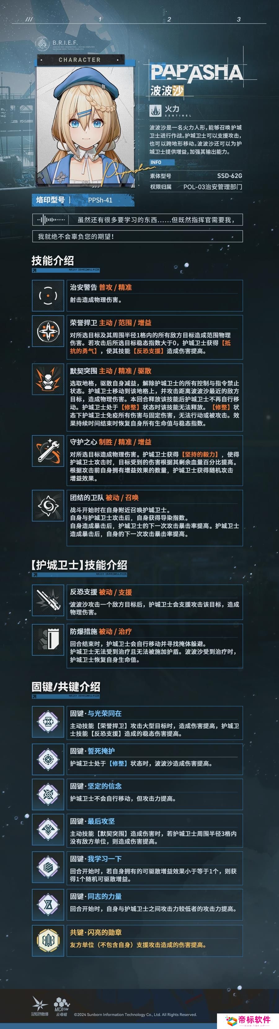 波波沙是一名火力人形,能够召唤护城卫士进行作战。护城卫士可以支援攻击,也可以跨地形移动。波波沙还可以为护城卫士提供增益,加强其输出能力。详情请看下图。