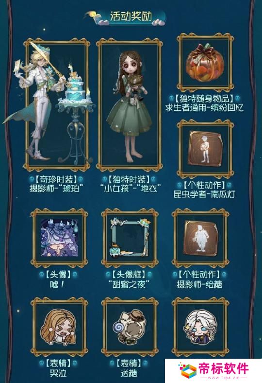 在主题活动海报中,【稀世时装】昆虫学者-“鬼烛”示意轻声,【奇珍时装】摄影师-“琥珀”正在万圣之夜为众人献上甜美的糖果,【独特时装】“小女孩”-“地衣”则手举蜡烛,为“捣蛋计划”做着准备。今夜,开始狂欢吧!