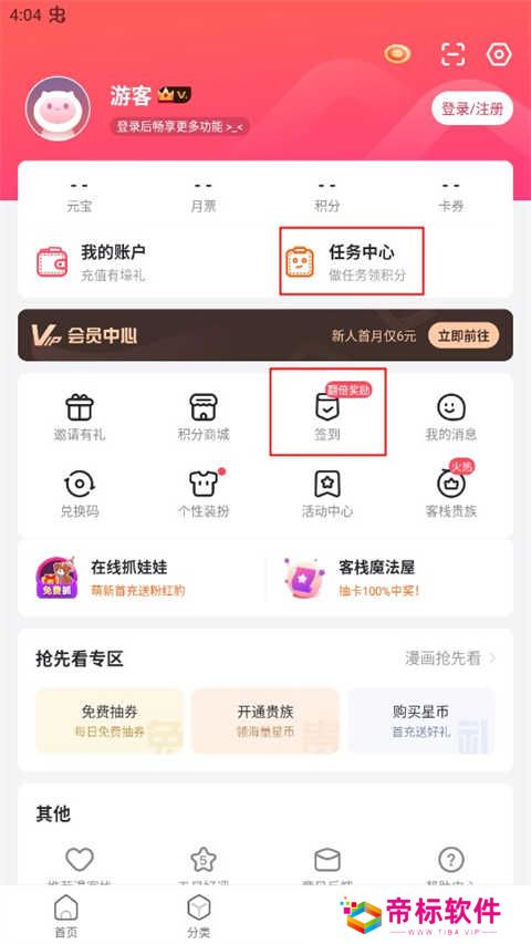 2、此外还可以在我的界面里找到任务中心和签到领取积分,这些积分都是可以兑换会员奖励的。