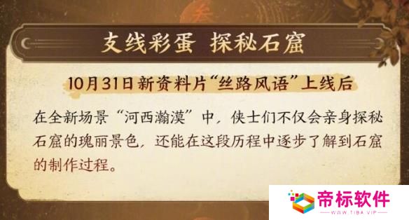 参与方式:前往全新场景【河西瀚漠】亲身探秘石窟并逐步了解到石窟的制作过程。