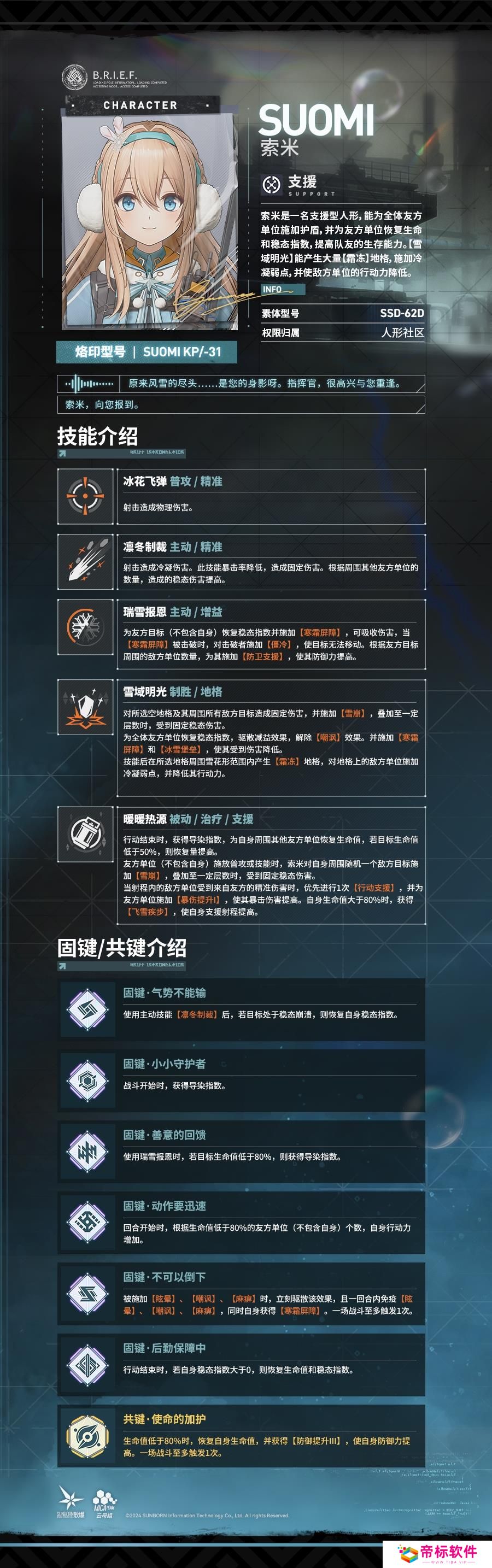 索米是一名支援型人形,能为全体友方单位施加护盾,并为友方单位恢复生命和稳态指数,提高队友的生存能力。【雪域明光】能产生大量【霜冻】地格,施加冷凝弱点,并使敌方单位的行动力降低。详情请看下图。