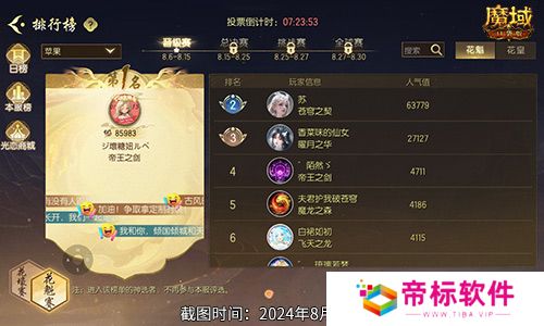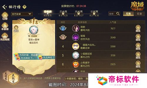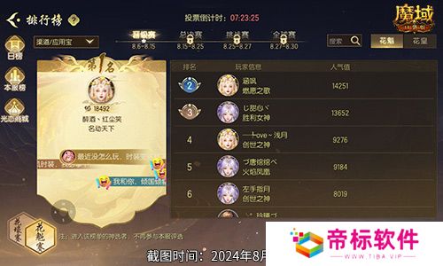 截止8月15日中午12:00,花魁赛晋级赛进入倒计时环节,恭喜玩家雪洛雷神以官方安卓服第一名的成绩即将晋级总决赛,她在这次比赛中凭借29407的超高票数脱颖而出。与此同时,玩家琦韵和瑶瑶分别以7677票和3549票的优异成绩暂获第二和第三名的好成绩。同样值得祝贺的是,玩家喵喵大仙女、眉眼如初、小熊等共九十七位选手暂居前一百名,即将晋级总决赛!